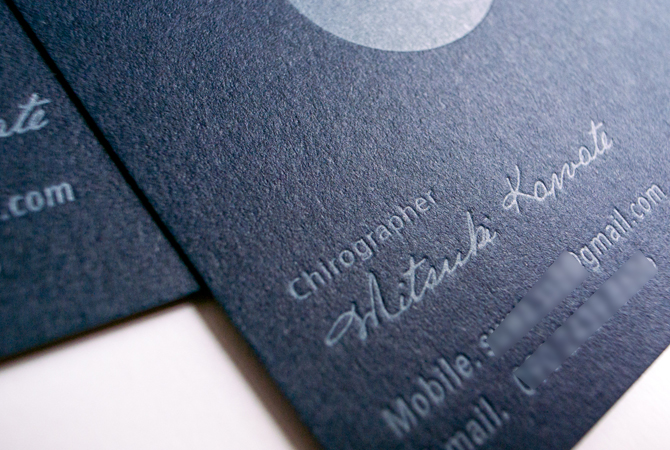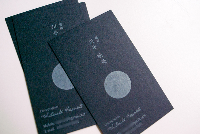 書家さんが使用する「雅印」という綺麗な印を、活版で作った○の中に押して使用します。 紺色に朱色が映えて、ぐっと締まった印象に。 「本物」って感じがします。日本人が印に対して持っているイメージかな。 一枚ずつ印を押しているので、全て違うのもいいね。 もらったらうれしいよね。 ご本人の手で完成させてもらうという、新しい形の名刺でした。