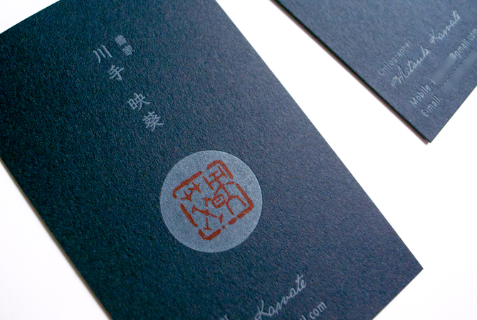 書家の友人の名刺デザインです。 すこし渋めのトーンで、新鮮で楽しい提案をさせてもらいました。 用紙は活版印刷用のコットン紙。紺色は用紙自体の色です。 深くてきれいな色。 この紙は繊維がやや粗めで、ざらっとした手触りがあるので、名刺を受け取ったお相手が 和の、日本の"書"という雰囲気をふわっと感じてくれればいいな、と。 和風です!!!って感じは希望ではなかったので、そこはやりすぎにならないように、 いかにも「和紙です!」という紙は避けました。