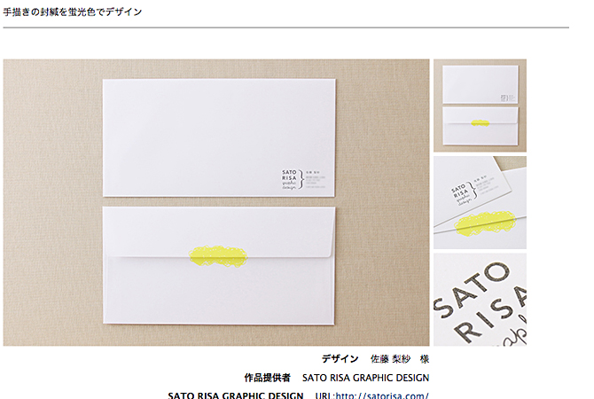社用封筒のデザインを、参考例として掲載していただきました。 「手描きの封緘を蛍光色でデザイン」 事務仕事で使う、いわゆる横長封筒です。 受け取った人にちょっとだけ楽しさがあればなーと思って、ぐるぐると手書きで封を描いたようなデザインにしました。 自分で使うもののデザインは自由すぎて逆に悩むと終わらないので、ささっと決めちゃうことが多いです。